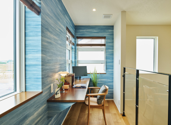 家の中でも仕事に集中でき、オンとオフを切り替え可能なリモートワークに適したワークスタジオ。天気の良い日には窓から富士山も眺められます。