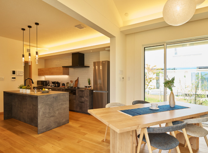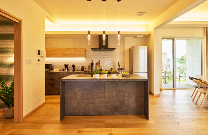 約15畳の広々スペース。視界を遮られることのない開放的なアイランドキッチンは動線が円形のため、家族みんなで調理を楽しむことができます。