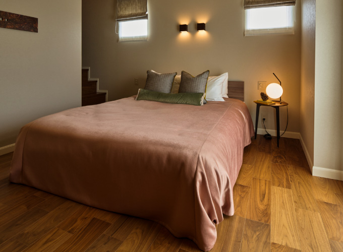 屋根の形状を活かして天井に傾斜をつけた勾配天井を擁する寝室1。通常の平天井よりも高さが出るため、室内に開放感が生まれるのが大きな魅力。
