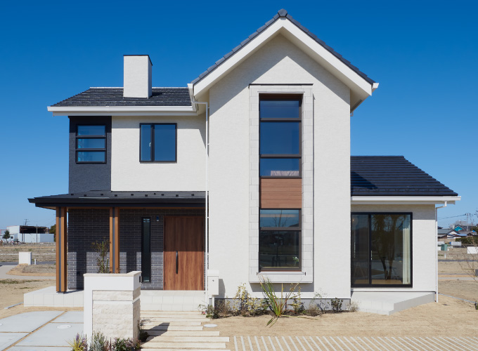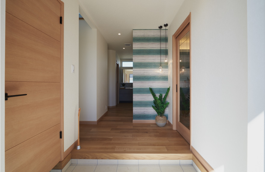 エントランスに足を踏み入れるとアクセントウォールがお出迎え。併設されたシューズクローゼットは、物置としても使えるくらい容量もたっぷり。