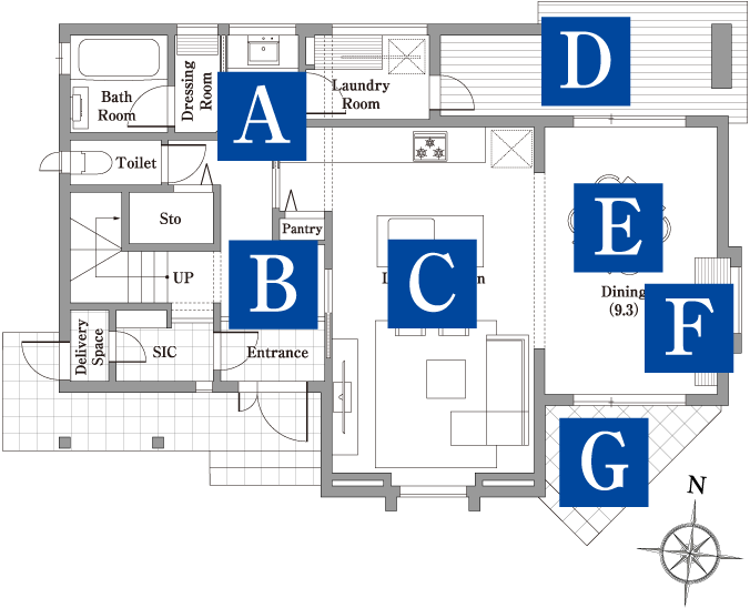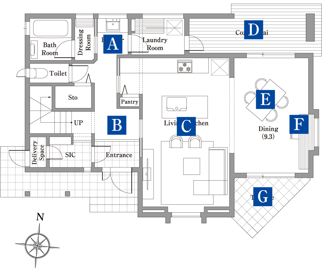 南北に開口部を設けた大型ダイニング。採光性に加え通気性も確保。コージーラナイとテラスにつながっているため、気ままに屋外へ足を運べます。