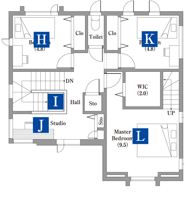 約2畳のウォークインクローゼットを擁した主寝室。南側の大きな窓は採光性を確保しつつ、東側の2つの窓からは朝日の光がやさしく差し込みます。