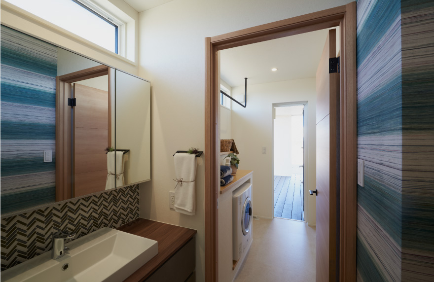 バスルームからコージーラナイを一直線に結んだ快適動線。お風呂上がりにパウダールームで身繕いをして、そのままコージーラナイでリラックス。
