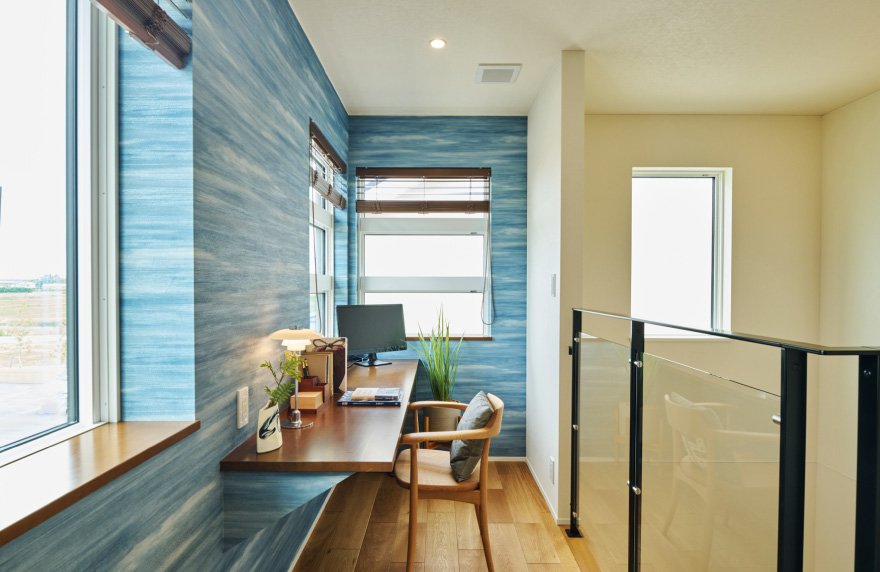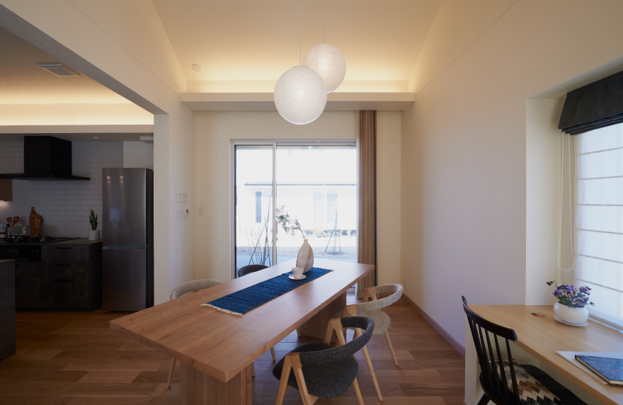 ダイニングのコーナーに配置された、開口部付きのワークスペース。奥様が趣味を楽しんだり、子どもの勉強を見てあげたりなど使い方もさまざま。