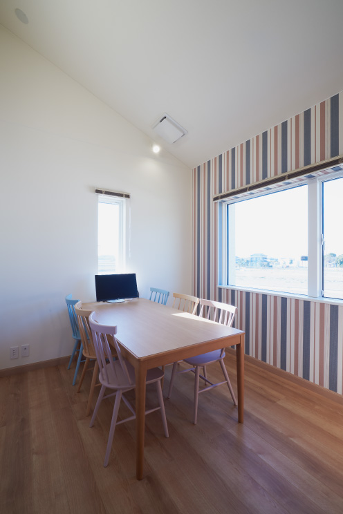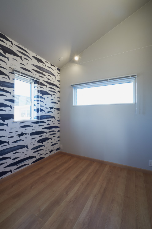 勾配天井を擁する寝室2。壁の面積も増えるため、明るくオープンな住空間づくりが可能に。かわいいアクセントクロスは子ども部屋にもおススメ。