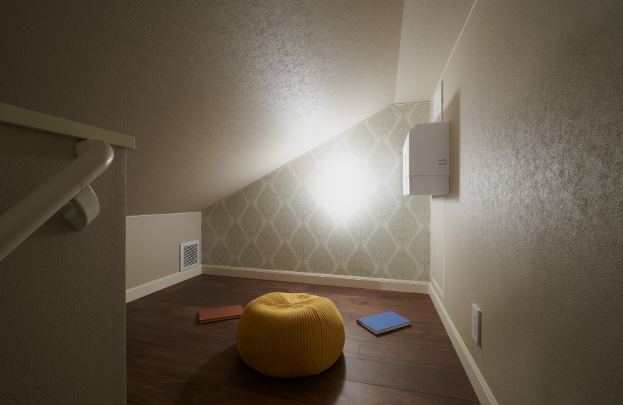 主寝室から出入り可能な、勾配天井のロフト。物置としての役割はもちろん、ご主人のちょっとした隠れ家的な書斎としても活用する事ができます。